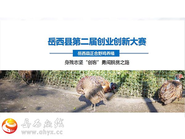 参赛企业:岳西县正合野鸡养殖 通过结合“互联网+农业”和“党建+扶贫”的创新模式,养殖无抗生素、无激素、无农药的放心生态野鸡,为外来游客和当地居民提供绿色有机食品。