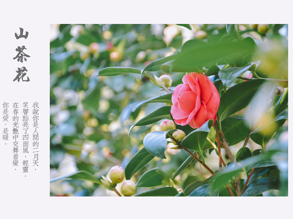 不少人对山茶花情有独钟,明代苏伯衡写到:“山茶优花红锦装,中有一支并蒂香,苻采烂若双鸳鸯,嫣然占尽三春光。”诗人杨升庵赞美山茶为:“绿叶红英斗雪开,黄蜂粉蝶不觉来,海边柱树无颜色,羞把琼枝照玉台。”郭沫若则写到:“茶花一树早桃红,百朵彤云笑傲中。”